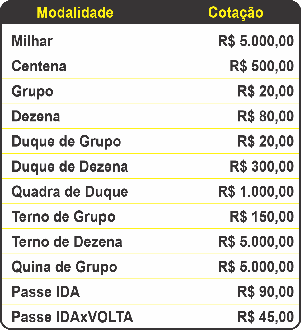 Temos as principais modalidades de jogos, todas elas semelhantes ao jogos de bancas fisícas. Entre elas temos: Grupo, Dezena, Centena, Milhar, Duque de Dezena, Terno de Dezena, Duque de Grupo, Terno de Grupo, Quadra de Grupo e Quina de Grupo.